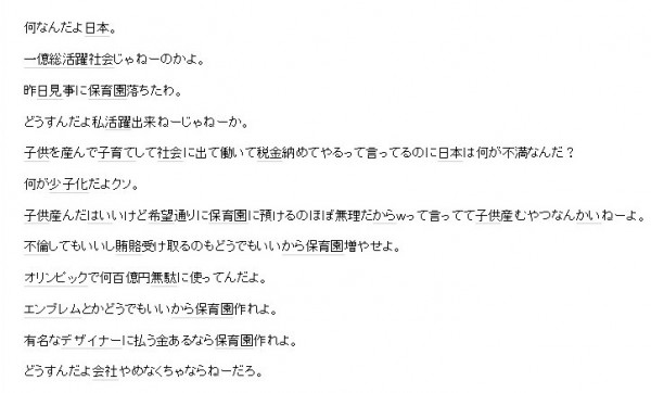 保育園の入園選考に子どもが落ちた怒りを綴った匿名ブログ「保育園落ちた日本死ね!!!」が反響を呼んでいます(子育てニュース参照。全文も)。内容に共感が広がる一方、表現方法などに疑問や批判の声も上がっています。あなたはこのブログに共感する?それとも…
