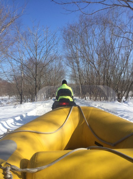 スノーモービルでゴムボートを引っ張ってもらうスノーラフトも体験。この日は15~20分間の「森林コース」(小学生以下300円、中学生400円、高校生以上600円)を選びました。エコパ内の雪原や森の中を、スピード感満点に滑走してくれます。